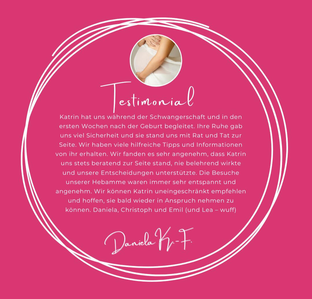 WochenbettbegleitungDas Wochenbett ist eine ganz besondere Zeit – die ersten Wochen nach der Geburt, in denen sich das Leben neu ordnet, ihr euch gegenseitig kennenlernt und intensiv in Beziehung geht - das ist der Grundstein für eine sichere Bindung und das größte Geschenk für euer Baby!Ich komme in dieser Phase zu euch nach Hause und begleite die natürlichen Rückbildungsprozesse des Körpers, schaue auf das Neugeborene und gebe euch wertvolle Tipps fürs Stillen und die Babypflege.Das Wochenbett ist eine aufregende Zeit voller neuer Aufgaben und Herausforderungen, sei es durch die hormonelle Umstellung, Schlafmangel oder den Baby Blues. Ich begleite euch nicht nur bei medizinischen Fragen, sondern begleite euch emotional auf eurem Weg in das Leben als Familie.Bei der ambulanten Betreuung gehst du innerhalb der ersten 24 Stunden nach der Geburt aus der Klinik nach Hause und ich besuche euch in den ersten fünf Lebenstagen eures Babys täglich. Danach stehen uns noch weitere sechs Termine zur Verfügung.